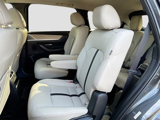 Inside the cabin you will find premium leather trimmed seats in both the first and second rows heated front seats an 8 way power driver seat with lumbar a 4 way power passenger seat second row captain’s chairs with center walk through three zone automatic climate control third row AC vents 2nd row sunshades paddle shifters a leather steering wheel Mazda Advanced Keyless Entry push button start and a wireless phone charger. The 10.25 inch color center display includes Android Auto Apple CarPlay Bluetooth® six USB inputs and Mazda Connected Services.