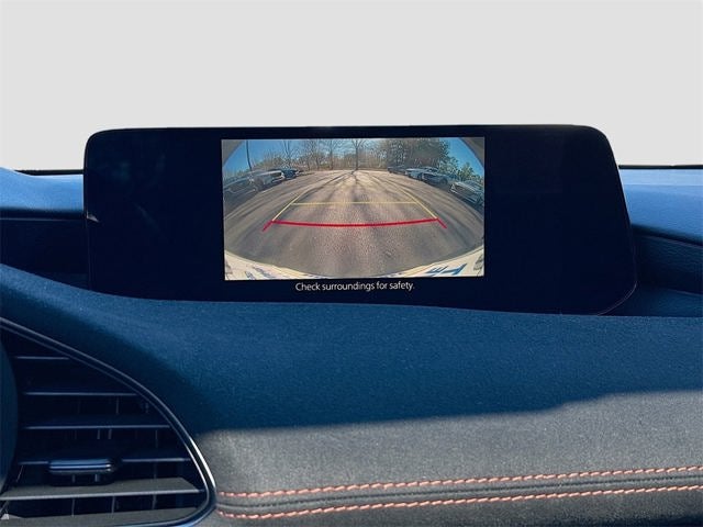 Safety is a top priority with features like Blind Spot Monitoring, Lane Departure Warning System, Lane Keep Assist, Mazda Radar Cruise Control with Stop & Go, and a Rearview Camera. The vehicle also includes advanced dual front airbags, front knee airbags, front and rear side-impact airbags, and front and rear side air curtains.